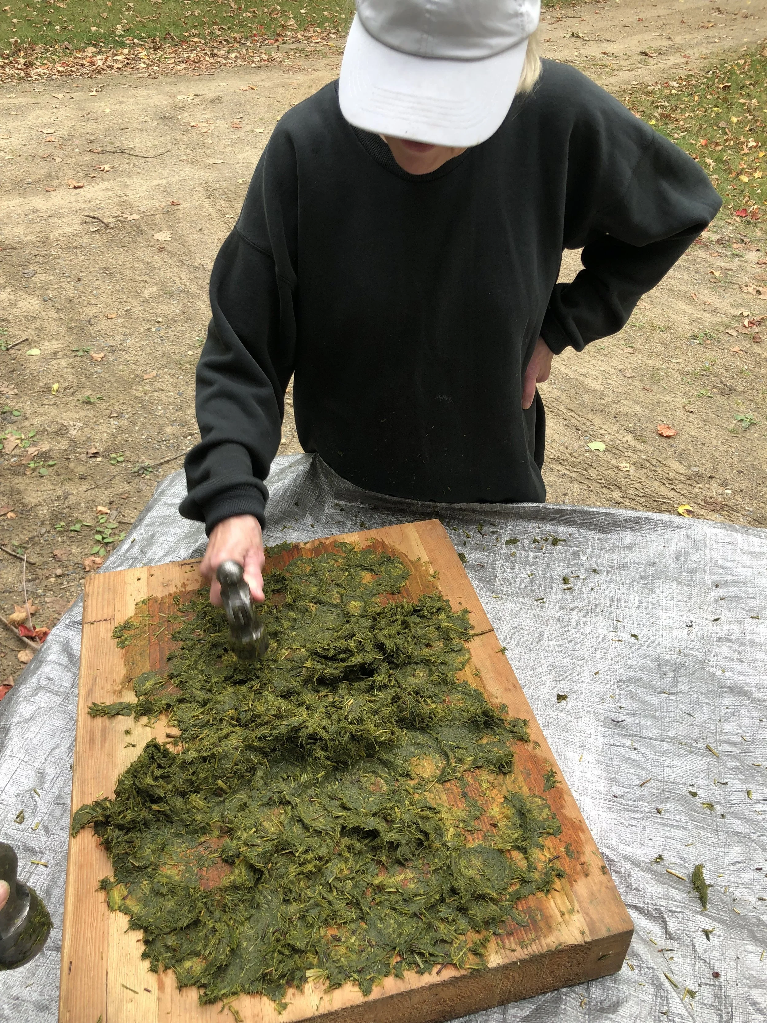 I didn't want to put my plant matter directly into the blender, which is a common at-home paper-making method. I was worried the fibers would be obliterated, cut too short. So I put my grandmother to work with a mallet and a butcher's block.