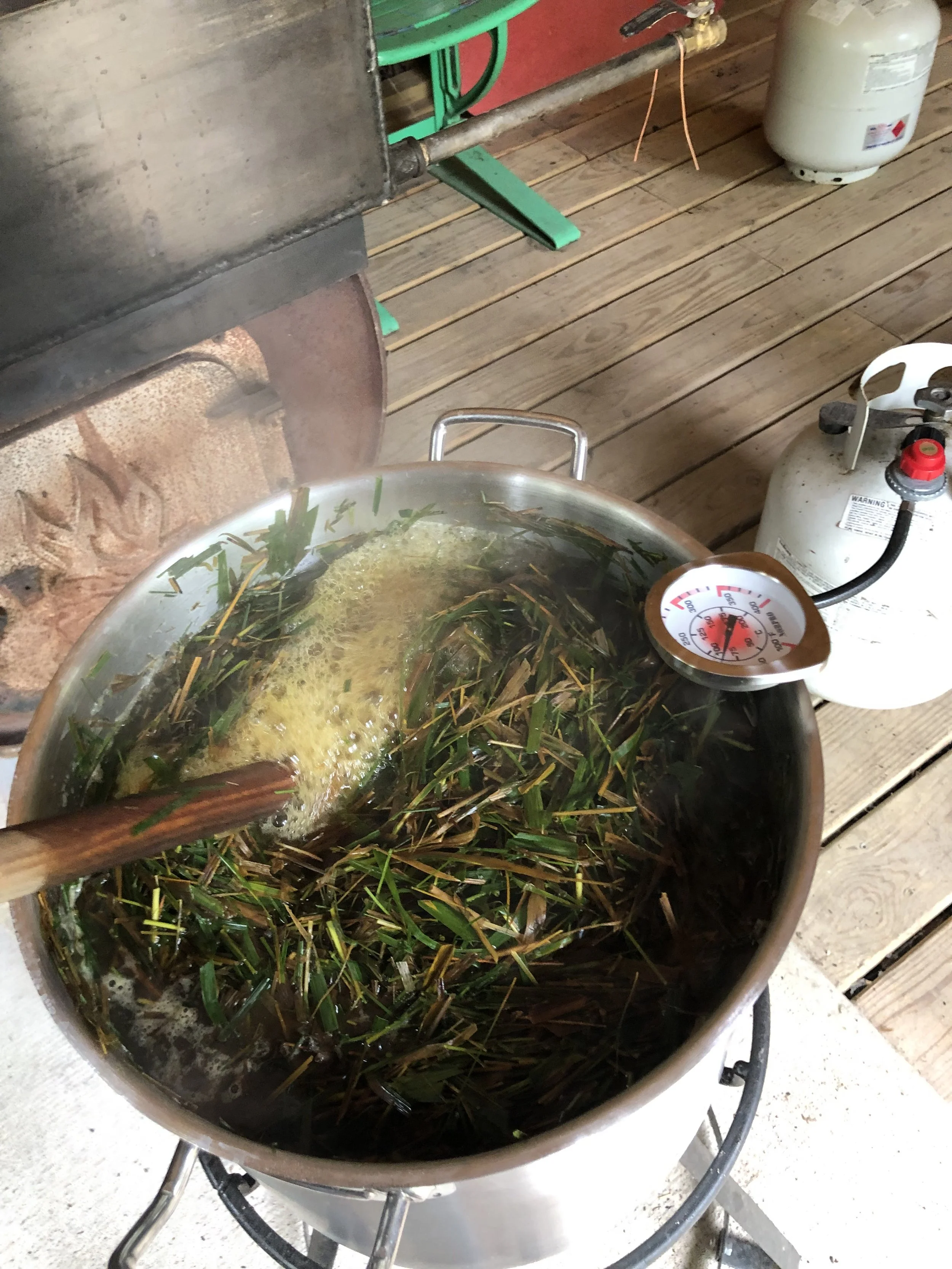 It took days. First, I harvested the grass with my grampa. I sat with my shears and cut the grass into halves and halves and dropped them into a bucket. Next, I boiled the matter in a big vat, with baking soda to break it down. I did it in the sugar shack, which is usually used for producing maple syrup in the spring.